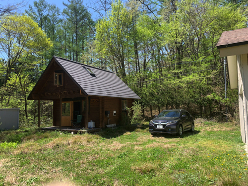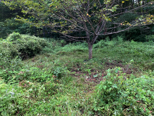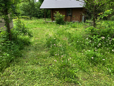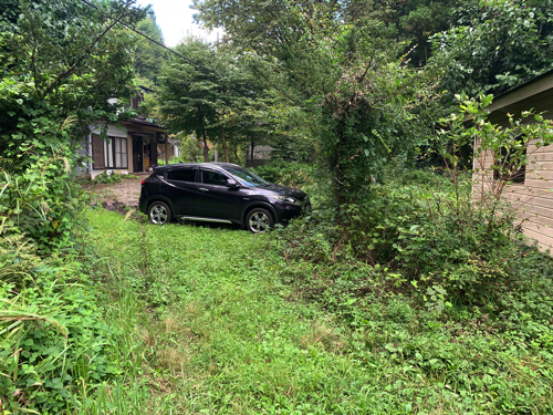 隣の家も見えるようになりました。 裏山の赤谷第二発電所への落水管の維持管理のための上り口に あたるので、駐車場とトイレ置き場として利用してもらっています |