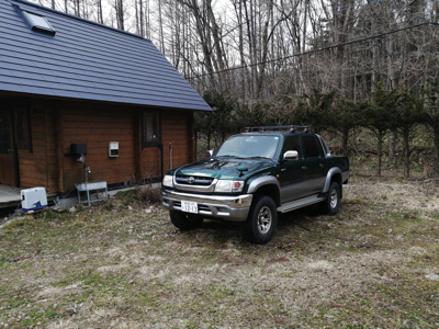 | 上田さんが作ってくれた「TOZ山荘」の看板 | 愛車ハイラックス |