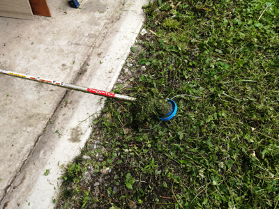 駐車場から門の入り口付近をナイロン草払い機で作業 しました。感動の綺麗さです。草が粉々に粉砕されて います。チップソーの時にはできなかったことです。 |