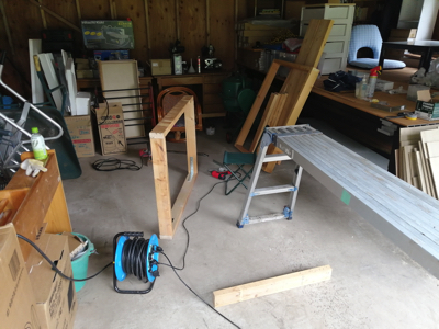 テラスの下の保存してある材木を取り出し、階段の 踊り場用に箱形の枠を作ります。 |