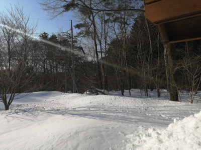 到着が遅くなったので、外は真っ暗です。 駐車場からログハウスまで匍匐前進です。 | 翌朝、太陽を浴びた雪庭は綺麗です。 |