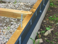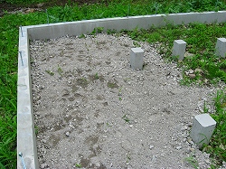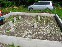 昨日の電話の通り、キソパッキンと水切り板が納品されましたので、今日中に土台材の完成 をしないとまずいことになりました。天気予報では雨天でしたが、天が味方してこの現場周 辺だけ、午後3時頃まで雨を降らさないでくれました。すごい! と言うことで、涼しいこともあり、猛スピードで土台が完成しました。下の写真の順で説明 します。